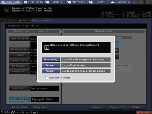 Explication supplémentaireSi Ecraser est sélectionné, les données sont écrasées par la condition papier enregistrée.