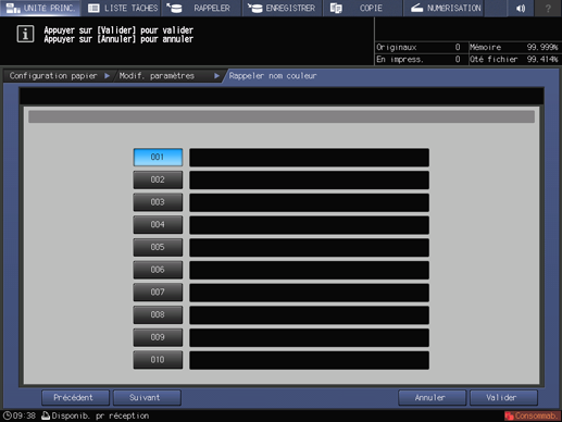 Sélectionnez le nom d'enregistrement, puis appuyez sur Valider. La liste affichée sur l'écran Liste réglage couleur par type papier indique les valeur de réglage du capteur de couleur par type de papier enregistré dans Contrôle densité couleur de l'écran Menu Réglage.