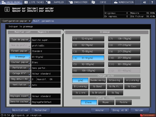 Vous pouvez sélectionner une vitesse de traitement avec les touches figurant sous Config. vitesse. Quand la capacité de fixation du toner est insuffisante, modifiez la vitesse de traitement. Moyen n'est disponible que dans AccurioPress C6100.
