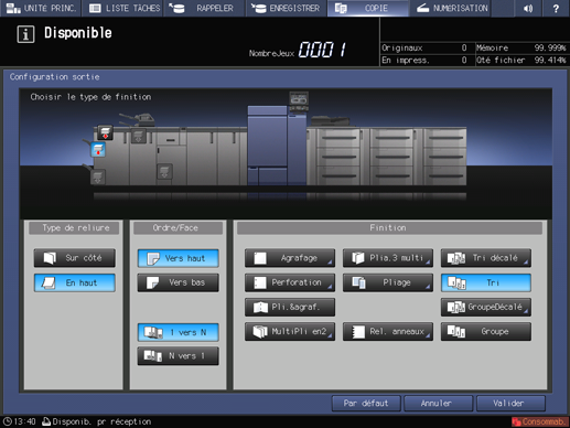 Pour réaliser des copies recto-verso imprimées tête en bas sur la face inverse des originaux 1 fac ou 2 faces ayant le même bord en haut de page, sélectionnez En haut comme Type de reliure dans le Réglage sortie. Sélectionnez Sur côté en mode normal de copie.