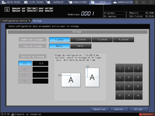 Quand Pliage en 3 est sélectionné, seuls deux rainages peuvent être appliqués au papier à plier en trois. Pour des détails, voirRainage de papier en mode Pliage en 3 multiple.