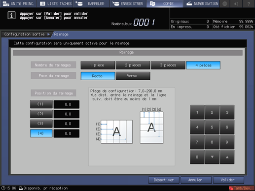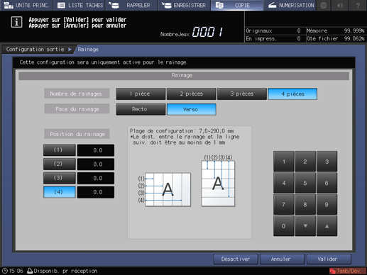 4 pièces : applique quatre rainages. Position rainage (4) : Papier La : (Position (3) + 1,0) mm à (La - 46) mm (par incréments de 0,1 mm) Papier Lb : (Position (3) + 1,0) mm à 290 mm (par incréments de 0,1 mm) |