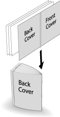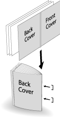 Pliage en 2 multiple Sélectionnez Rainage - Activé sur l'écran de réglage MultiPli en2. | Lorsque Insertion couv. est sélectionné en combinaison avec Livret de la fonction d'application, un rainage est appliqué uniquement à une couverture pour Pliage en 2 multiple et la couverture est pliée en deux avec le corps. Cette fonction peut être combinée avec la fonction de massicotage du bord supérieur. |