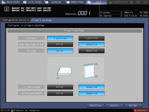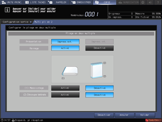 Ceci affiche l'écran de réglage Pliage & Agrafage ou Pliage en deux multiple.