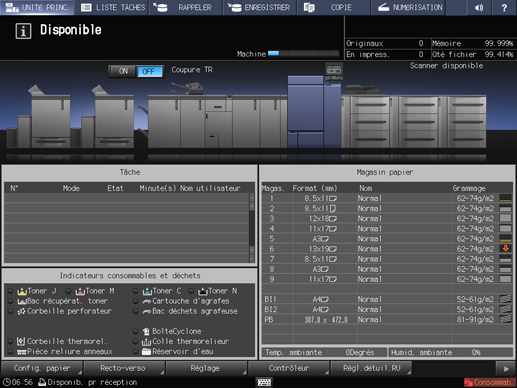 Appuyez sur ON pour le sélecteur de chauffage interne du thermorelieur sur l'écran UNITÉ PRINC. pour lancer le préchauffage du thermorelieur. Le message à droite du sélecteur de chauffage interne du thermorelieur passe de Coupure TR à Préchauffe TR.