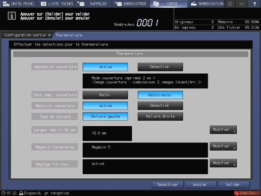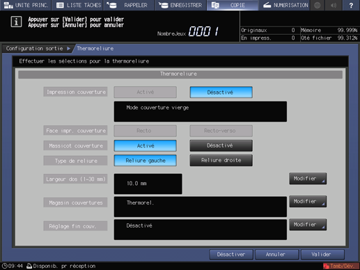 L'icône Thermoreliure s'affiche sous Réglage sortie sur l'écran COPIE.