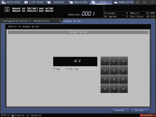 Lorsqu'un jeu est imprimé, l'épaisseur réelle des pages de corps s'affiche sur l'écran Thermoreliure.