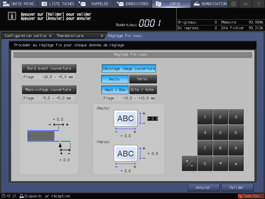 Explication supplémentairePour régler le bord avant de la couverture, appuyez sur Bord avant couverture. Utilisez le pavé numérique de l'écran tactile, down, up ou le pavé numérique du panneau de contrôle pour entrer la valeur désirée, puis appuyez sur +/- pour sélectionner une valeur de réglage positive ou négative.