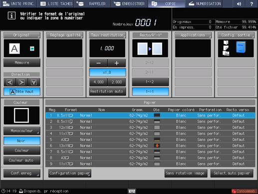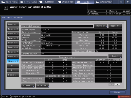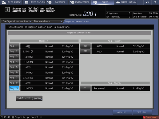 Explication supplémentaireLa sélection d'un magasin parmi Magasin 1 à Magasin 9 active la commande d'impression des couvertures.