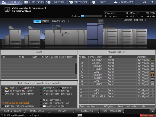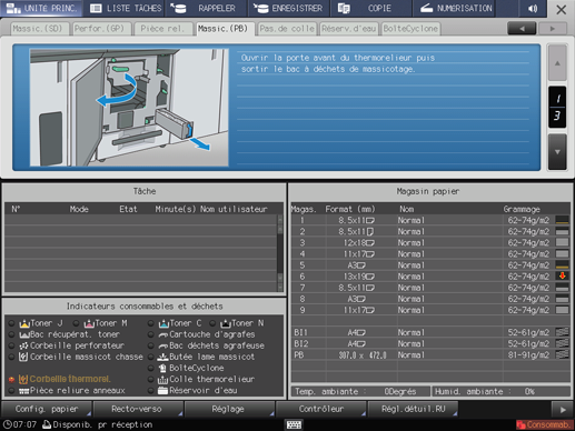 Appuyez sur l'indicateur Corbeille thermorel. dans la zone Indicateurs consommables et déchets de l'écran UNITÉ PRINC.