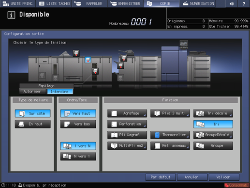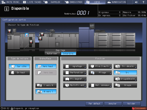 Explication supplémentaireSélectionnez parmi Tri décalé, Tri, GroupeDécalé et Groupe sous Finition.