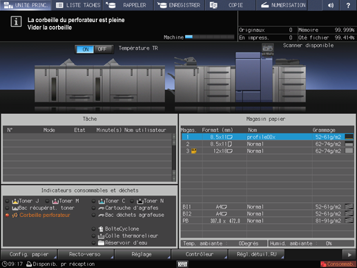 Appuyez sur l'indicateur Corbeille perforateur dans la zone des indicateurs des consommables et des déchets de l'écran UNITÉ PRINC.