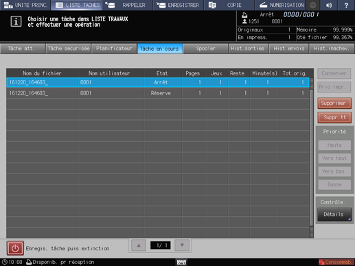 Explication supplémentairePendant la copie d'interruption, la tâche d’interruption s'affiche en haut de la liste En impression de l'écran LISTE TÂCHES.