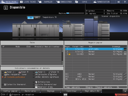 De même l'indicateur Corbeille perforateur dans la zone Indicateurs consommables et déchets de l'écran UNITÉ PRINC. s'allume en rouge et le texte est affiché en jaune.