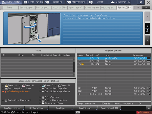 Appuyez sur l'indicateur de la corbeille perforateur dans la zone des indicateurs des consommables et des déchets de l'écran UNITÉ PRINC.