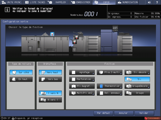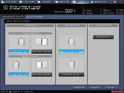 Explication supplémentaireIl est recommandé d'appuyer sur le bouton Copie test du panneau de contrôle pour imprimer une copie test avant de réaliser la reliure de jeux multiples.