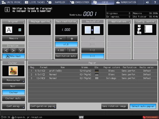 Appuyez sur Valider sur l'écran Réglage sortie pour revenir à l'écran COPIE.