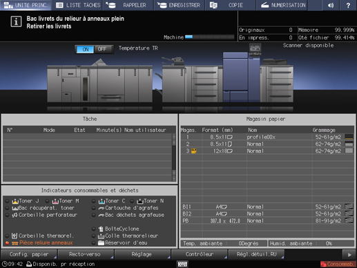 Le panneau d'affichage du relieur à anneaux affiche l'écran ALERTE - Fournitures/Bacs et le message Vider le tiroir Livret.