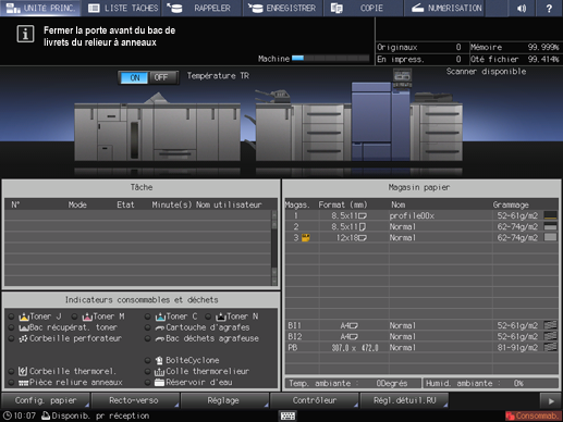 Si le bac Livret n'est pas remis en place correctement, le message Fermer la porte avant du bac Livret du relieur à anneaux s'affiche dans la zone de message de l'écran.