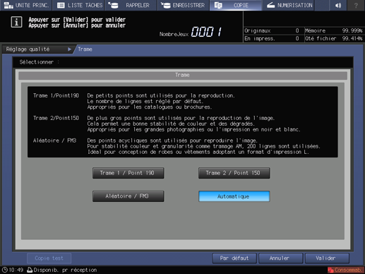 L'écran Réglage qualité s'affiche.