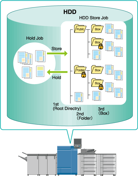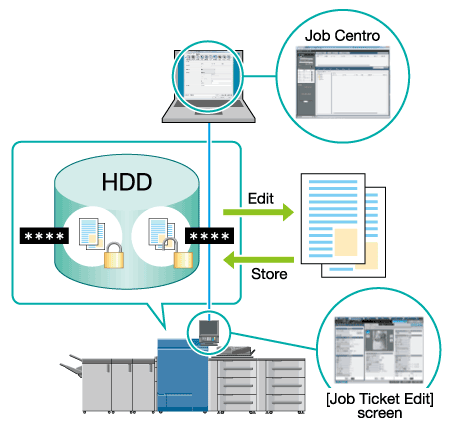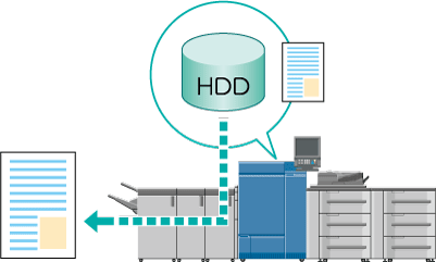 Vous pouvez enregistrer sur le disque dur les tâches numérisées sur la machine et les travaux d'impression d'un ordinateur. Vous pouvez imprimer une tâche enregistrée en modifiant le bon de travail ou l'envoyer à un ordinateur du réseau.
