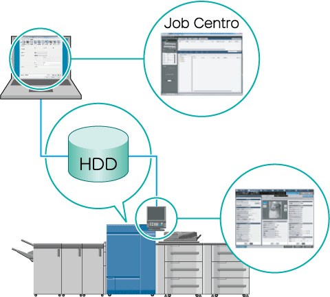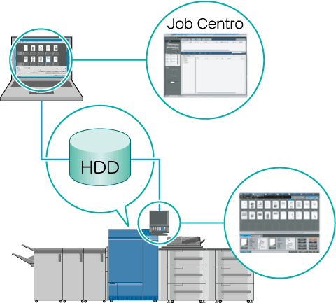 Vous pouvez exécuter les tâches depuis l'écran tactile de la machine ou sur un ordinateur doté de Job Centro.