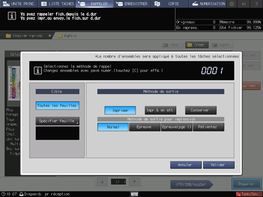 La tâche spécifiée est envoyée à En impression pour être imprimée. Pour des détails, voirOpérations de tâche en cours.