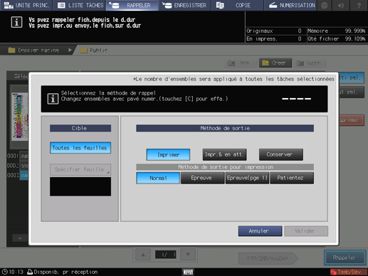 Explication supplémentaireEn cas de sélection multiples de tâches, le nombre de copies s'affiche ainsi - - - -. Vous ne pouvez pas effectuer la sortie sans saisir le nombre de copies. Même si le nombre de copies que vous avez entré est répercuté sur toutes les tâches sélectionnées, les informations concernant le nombre d'exemplaires des tâches sont conservées.