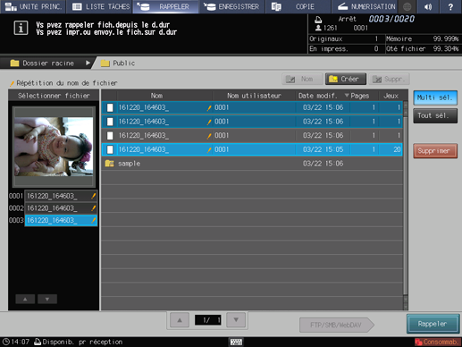 Explication supplémentaireSi des données existantes ont le même nom de fichier, [Répétition du nom de fichier] s'affiche en haut à gauche du tableau de liste et la marque