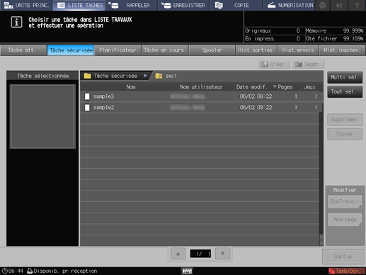 Pour en savoir plus sur les fonctions de modification des tâches sur l'écran LISTE TÂCHES, comme l'enregistrement sur disque dur, voir Bon de travail : modification de la configuration d'impression d'une tâche.