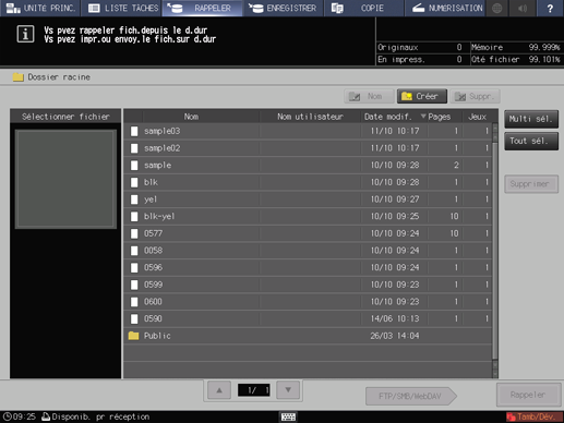 Appuyez sur l'onglet RAPPELER pour afficher l'écran Dossier racine sur l'écran RAPPELER.