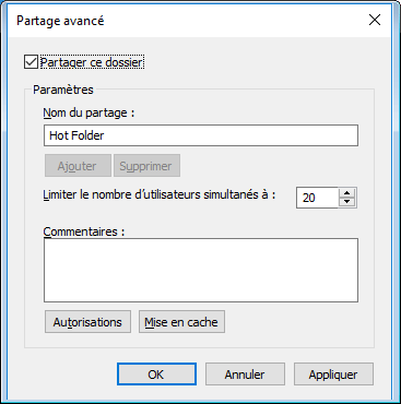 Faites un clic droit sur le hot folder à partager et cliquez sur Propriétés.