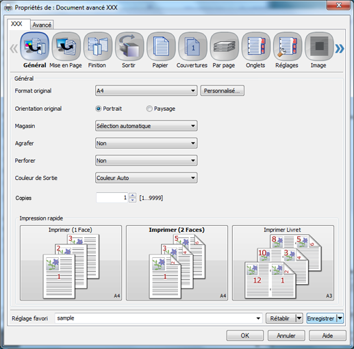 Cliquez sur l'onglet en haut de la page et configurez le réglage d'impression qui convient.