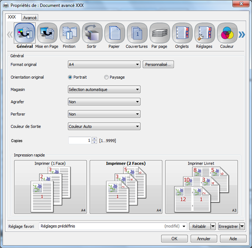 Réglage Favori et Général sont les fonctions proposées par le pilote Plug-in PS. En revanche, elles ne sont pas disponibles dans les autres pilotes.