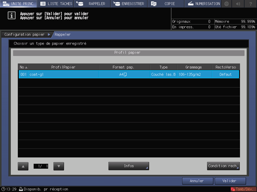 Appuyez sur Rappeler, vérifiez que le profil papier a été enregistré, puis appuyez sur Valider.