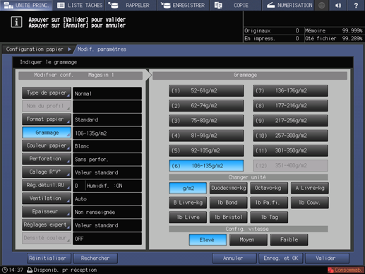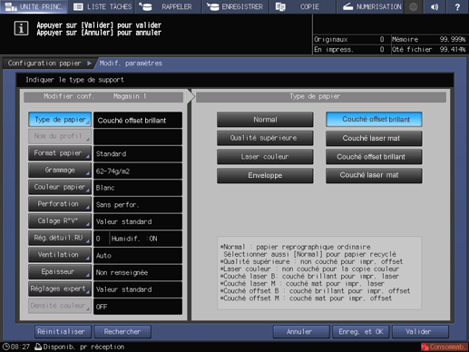 Explication supplémentaireEn plus du grammage et du type de papier, vous pouvez définir le format papier, la couleur papier, la perforation, le calage recto-verso, le réglage détuilage RU, l'épaisseur et la densité couleur sur l'écran Modif. paramètres.