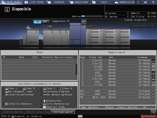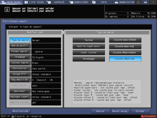Explication supplémentaireVous pouvez définir Type de papier / Nom du profil / Format papier / Grammage / Couleur papier / Perforation / Calage recto-verso / Rég.détuil.RU / Épaisseur / Densité couleur.