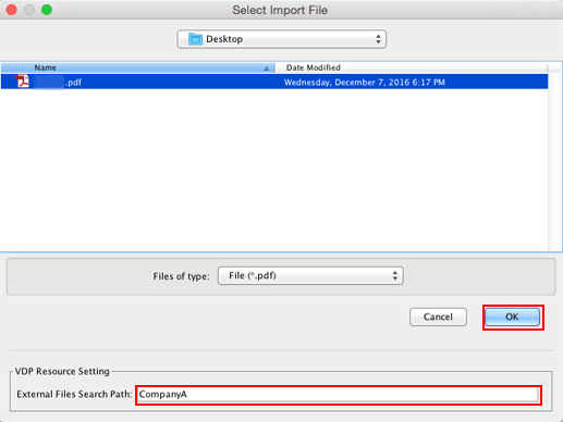 • Explication supplémentairePar exemple, pour créer un sous-dossier appelé CompanyA sous le dossier pdfvt et ensuite importer des fichiers, spécifiez CompanyA dans le chemin de recherche des fichiers externes.
