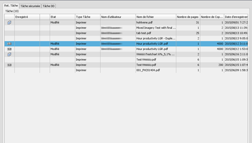 PDL | Affiche les tâches PS, PDF, PDF (APPE), TIFF, JPEG ou PPML uniquement. Les tâches en dehors des tâches PS, PDF, PDF (APPE), TIFF, JPEG ou PPML ne sont pas affichées. |