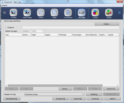 Les éléments de réglage sont ici les mêmes que ceux de l'écran "Par page" du pilote du Plug-in PS à l'exception de réglages Onglets, Haut, Bas, Ajouter et Editer. Pour en savoir plus sur les éléments de configuration commune, voir Ecran [Par page].