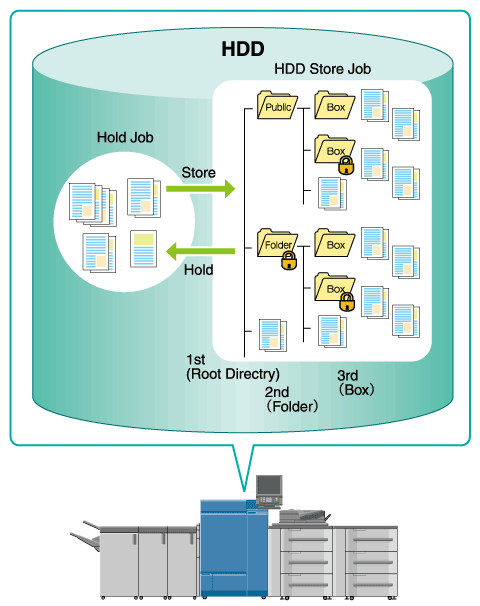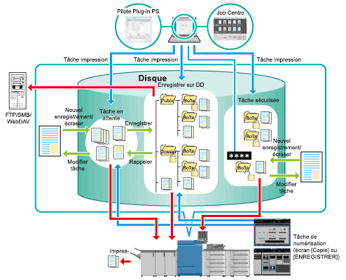 Vous pouvez enregistrer les données numérisées avec la machine (tâche numérisée sur l'écran COPIE et sur l'écran ENREGISTRER ainsi qu'une tâche d'impression d'un ordinateur en tant que tâche en attente ou tâche enregistrée sur disque dur .