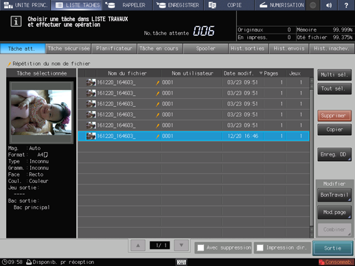 Ecran Tâche en attente | S'affiche en appuyant sur l'onglet Tâche att. de l'écran LISTE TÂCHES. Il permet de sortir, dupliquer ou supprimer les tâches en attente. Il propose aussi les fonctions d'enregistrement sur disque dur et de modification de tâche. |