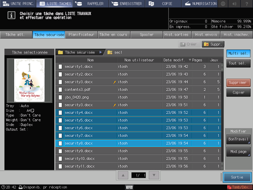 Les travaux d'impression consignés dans la boîte sécurisée s'affichent.