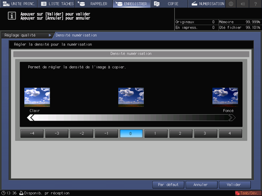 Réglez la densité numérisation de tout l'original, la densité du fond de l'original, les contours et le contraste. Réglez également le niveau de séparation sortie de la partie texte et de la partie photo d'une image.