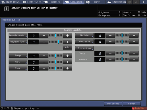 Par défaut sur l'écran Réglage qualité, tous les réglages de qualité sont rétablis à leur valeurs par défaut respectives.