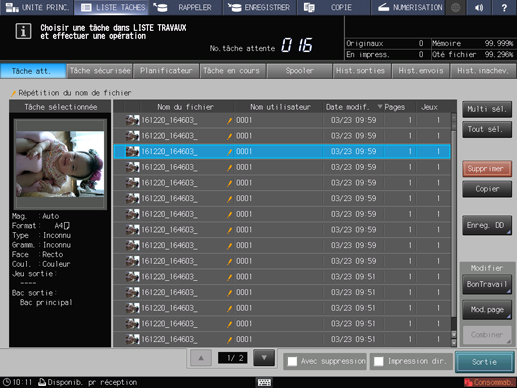 Appuyez sur l'onglet LISTE TÂCHES pour afficher l'écran LISTE TÂCHES.