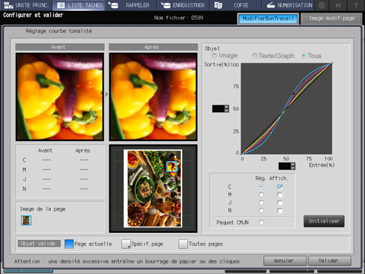 Vous pouvez régler la luminosité et le contraste de chaque couleur en modifiant la courbe de tonalité de chacune des couleurs CMJN ou la courbe de tonalité du paquet CMJN dans les données image de la tâche en attente. Vous pouvez aussi régler la courbe de tonalité de chaque onglet (image ou texte/graphiques).