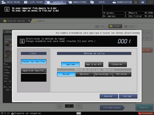 Explication supplémentaireVous pouvez imprimer et mettre en attente un travail enregistré sur le disque dur ou le mettre en attente sans l'imprimer.
