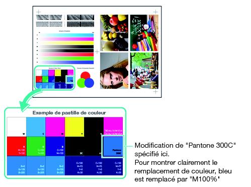 "Pantone 300C" dans "Exemple de pastille de couleur" est utilisé à titre d'exemple dans l'exemple B. La couleur bleue dans "Pantone 300C" est remplacée par "M100%" à l'impression.