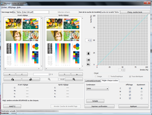 Sous Réglage, sélectionnez les cases d'option des couleurs que vous souhaitez régler (C/M/J/N). Cliquez sur la courbe de tonalité et glissez la poignée affichée (point d'exécution) pour régler la courbe de tonalité.